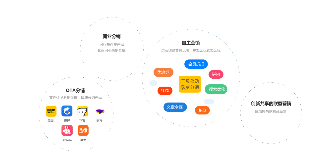 提供OTA分銷、同行渠道分銷、自主營銷玩法(移動裂變分銷、優(yōu)惠劵、秒殺等)、創(chuàng)新共享聯(lián)盟營銷等多種營銷策略,